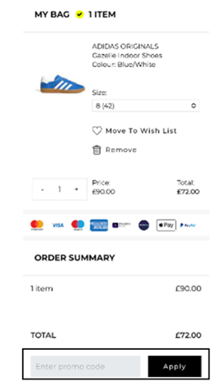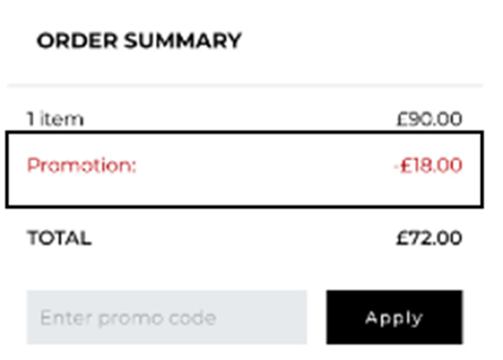 Ha olyan promóciós kódot használ, amely jelenleg a weboldalunkon található, akkor azt hozzáadhatja a "bevásárló kosarához". Mindössze annyit kell tennie, hogy beírja a promóciós kódot a "teljes" rendelési összeg alatti mezőbe, majd válassza az "Alkalmazás" lehetőséget.