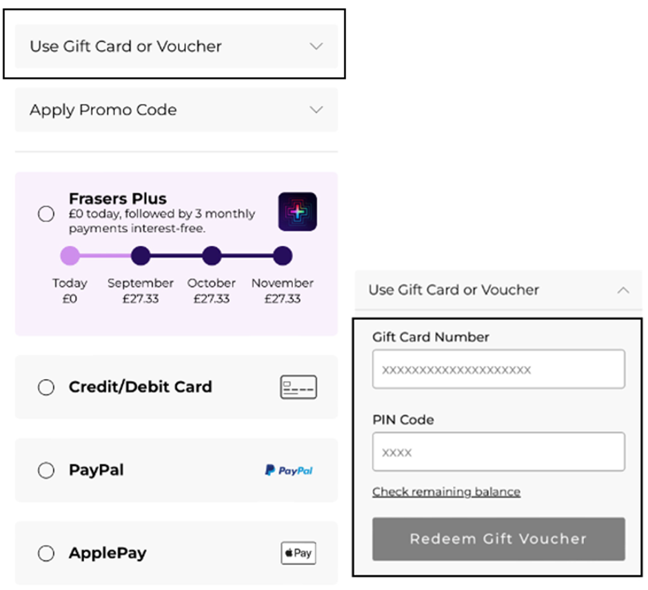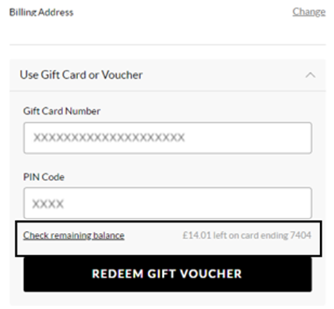 Az ajándékkártya vagy eVoucher egyenlegének megtekintéséhez először a kosárba kell helyeznie a termékeket, majd miután kiválasztotta a szállítási módot, a fizetési részhez jut. Itt megjelenik a megrendeléséhez rendelkezésre álló összes fizetési lehetőség. Válassza az "Ajándékkártya vagy eVoucher használata" lehetőséget, és adja meg az eVoucher/utalvány kódját és PIN-kódját, majd válassza a "Maradék egyenleg ellenőrzése" lehetőséget, ekkor láthatja egyenlegét.